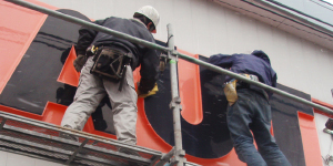 自社所有の高所作業車により、設置の難しい高所や壁面、サインポールなどの看板も問題なく設置できます。屋上看板・広告も対応可能です。